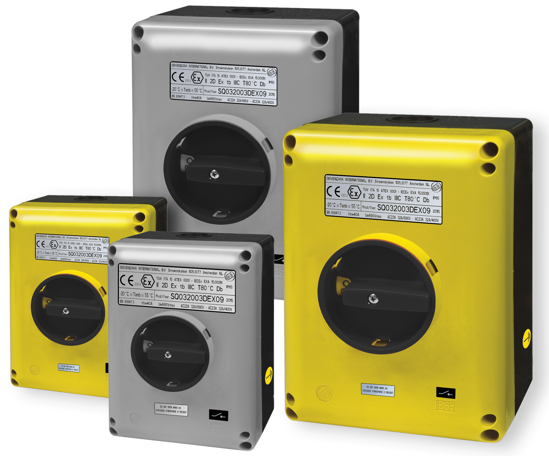 Giovenzana International presenta i nuovi sezionatori Regolus Ex di comando ed emergenza in custodia di alluminio, verniciati in grigio e giallo, sono adatti per l'utilizzo in Zona 21 e 22 (Polveri) con correnti nominali di 25-32-40-63-80-100A con 3 o 4 poli.