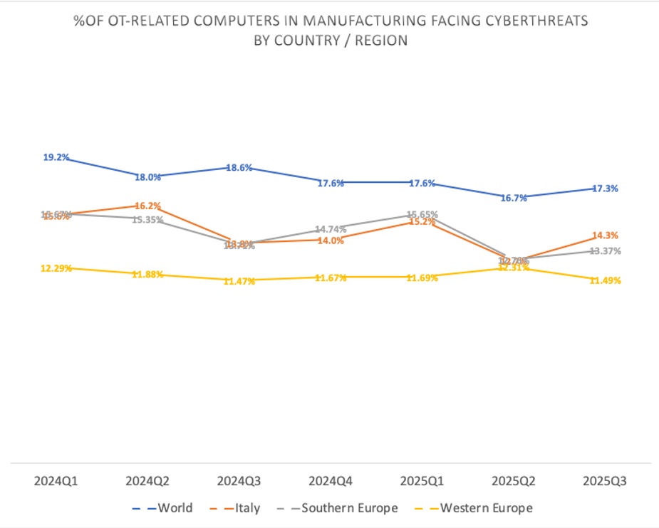 Le differenze regionali restano marcate. Le aree maggiormente colpite sono Africa, Sud-Est asiatico, Asia orientale, Medio Oriente e Asia meridionale, dove l’esposizione delle infrastrutture OT alle minacce informatiche è più elevata rispetto alla media globale.