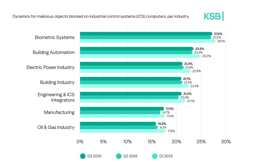 L’analisi per settore mostra come tutti i comparti industriali critici continuino a essere bersagli prioritari. In testa si collocano i sistemi legati alla biometria, con il 27,4% dei computer ICS su cui sono stati bloccati oggetti dannosi. Seguono la building automation (23,5%), l’energia elettrica (21,3%), l’edilizia (21,1%), l’ingegneria e integrazione OT (21,2%), il manifatturiero (17,3%) e il settore oil & gas (15,8%).