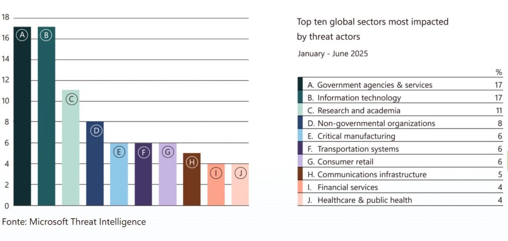 Il Microsoft Digital Defense Report 2025, che analizza il periodo da luglio 2024 a giugno 2025, evidenzia un forte incremento delle minacce digitali globali. Oltre il 52% degli attacchi informatici ha finalità di estorsione o ransomware, mentre solo il 4% è dedicato ad attività di spionaggio puro. I criminali mirano a bloccare sistemi e rubare dati per ottenere riscatti, colpendo in particolare infrastrutture pubbliche e servizi essenziali.