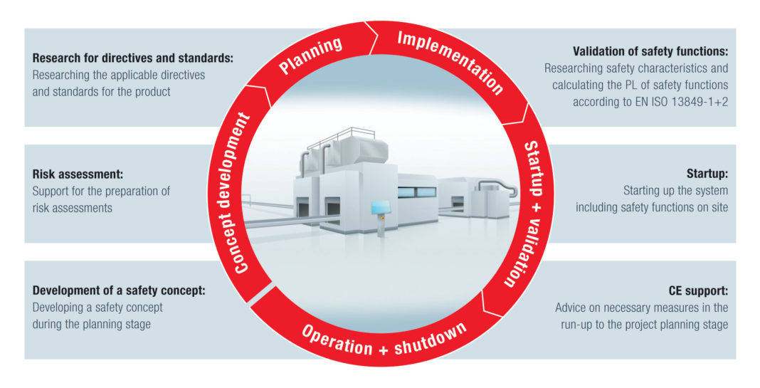 Sew-Eurodrive ha raggruppato le 16 fasi del “ciclo di vita” della sicurezza come da IEC 61508 in pratiche unità e offre pacchetti di servizi completi, come si conviene ad un partner competente. Il regime di Functional Safety Mana-gement (FSM) certificato è la base per essere certi di applicare correttamente le direttive e gli standard ancor prima di pianificare il progetto. Utile ausilio il supporto per la valutazione dei rischi e lo sviluppo del concetto safety in fase di prima progettazione come anche la pianificazione e lo startup del sistema on site (funzioni safety incluse). A richiesta ci si avvale del software wizard Sistema per l’analisi e la validazione delle funzioni safety (calcolo del PL) secondo EN ISO 13849-1+2. Tramite la consulenza durante l'intero corso del progetto viene assicurata una linea di azione ottimale e si è certi di perseguire le opportune richieste in ter-mini di sicurezza senza eccessivo stress; ciò previene, tra l’altro, eventuali misure correttive, dispendiose in termini di tempo e di costo, se apportate a posteriori nell’ultima parte del progetto.