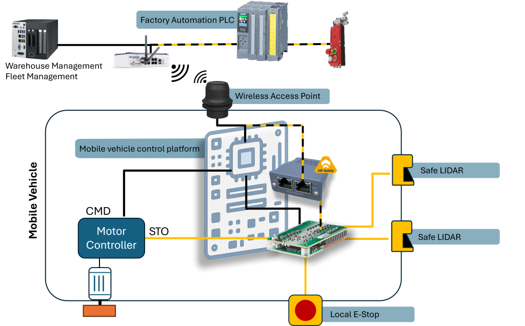 Tra le applicazioni specifiche, troviamo AGV e AMR nei quali non è attualmente implementata alcuna logica di sicurezza locale, oppure i sensori di sicurezza esistenti (ad esempio, scanner di sicurezza con uscita OSSD) devono essere combinati con un segnale di arresto di sicurezza remoto tramite una rete fieldbus di sicurezza, apportando minime modifiche.