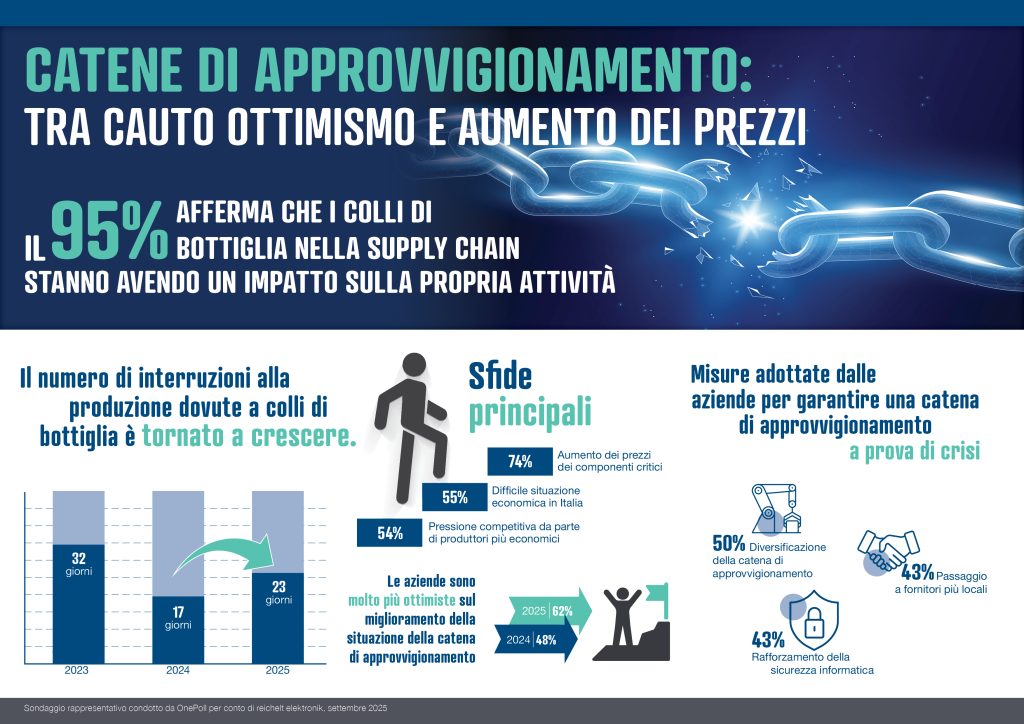 La supply chain resta sotto pressione. Il Supply Chain Report 2025 di reichelt elektronik, condotto da OnePoll su 250 aziende italiane, mostra che il 95% registra ancora interruzioni. Il 28% segnala disagi gravi e le fermate produttive per colli di bottiglia sono salite a 23 giorni, contro i 17 dello scorso anno. Tuttavia, l’approvvigionamento di componenti appare meno difficile: solo il 17% lo considera critico, contro il 44% del 2024. Segnali incoraggianti arrivano anche dalle aspettative: il 62% prevede un miglioramento nei prossimi dodici mesi.